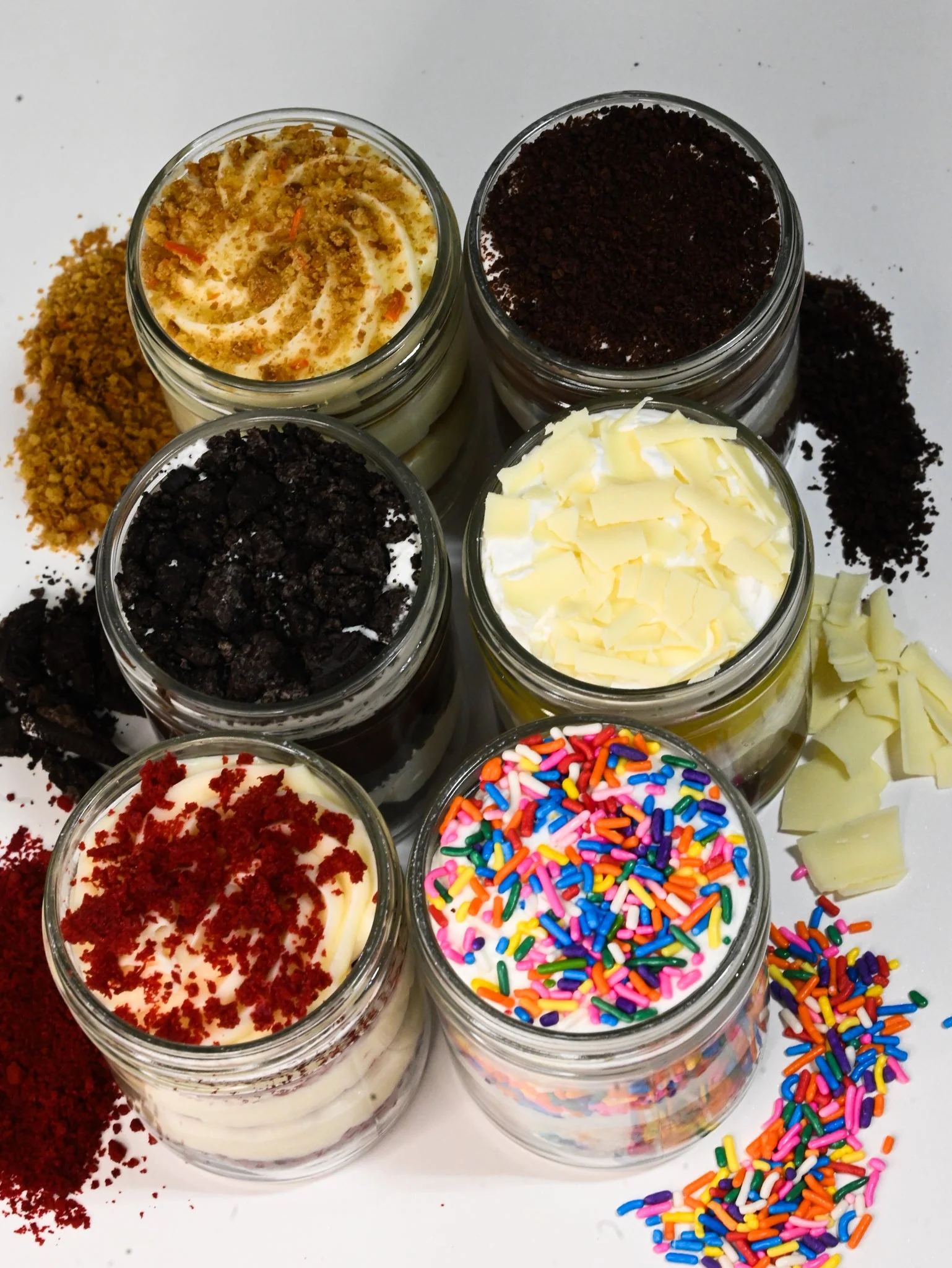 Indulge in the delightful experience of our fresh, made from scratch cake jars layered meticulously with assorted gourmet fillings. All crafted and artfully presented in a convenient, reusable 8oz glass jar - equivalent of 2 large cupcakes!